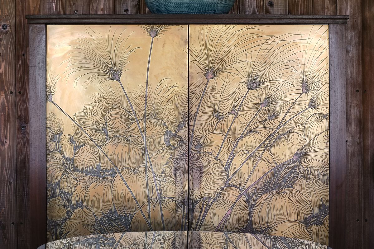 • Timber Wardrobe by Otto du Plessis, with etched brass doors featuring Moremi Delta flora by artist Trevor Potter.